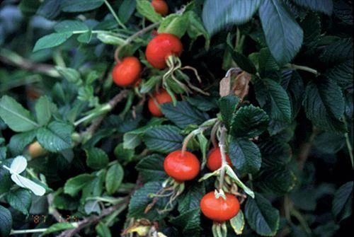 This Danish rose is famous for having extremely large hips. Loads of large round flavorful crimson hips decorate the 2.5” tall, disease resistant bush. Grow it on a small trellis or use its sprawling habit to make a great mass planting. Starting in June and through the Autumn it is covered with pretty pale pink single flowers with soft yellow stamens. Each fall it sports flowers and large tasty red hips at the same time.